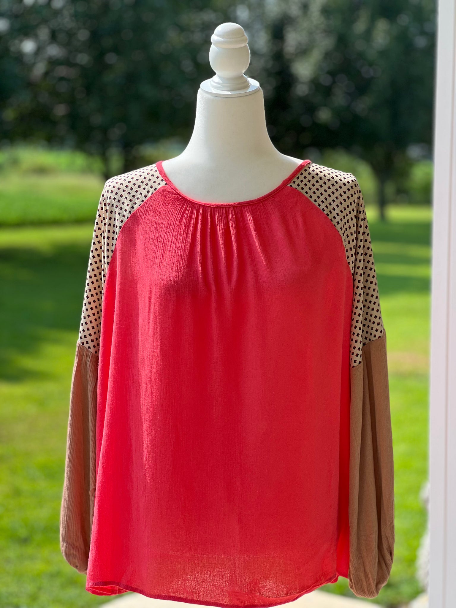 SOLID AND PRINT MIXED COLOR BLOCK WOVEN BLOUSE TOP WITH CONTRASTED PUFF SLEEVES AND TIE BACK DETAIL